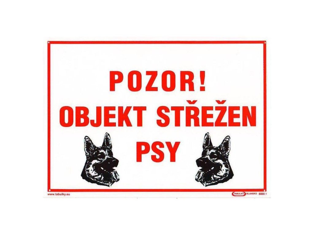 Tabulka - - POZOR! OBJEKT STŘEŽEN PSY 210 x 297 mm, (A 4), PH. rozměry: 210 x 297 mm materiál: plast Bezpečnostní tabulka, jejímž účelem je opatření a snížení rizik.Obrázky jsou pouze ilustrativní.