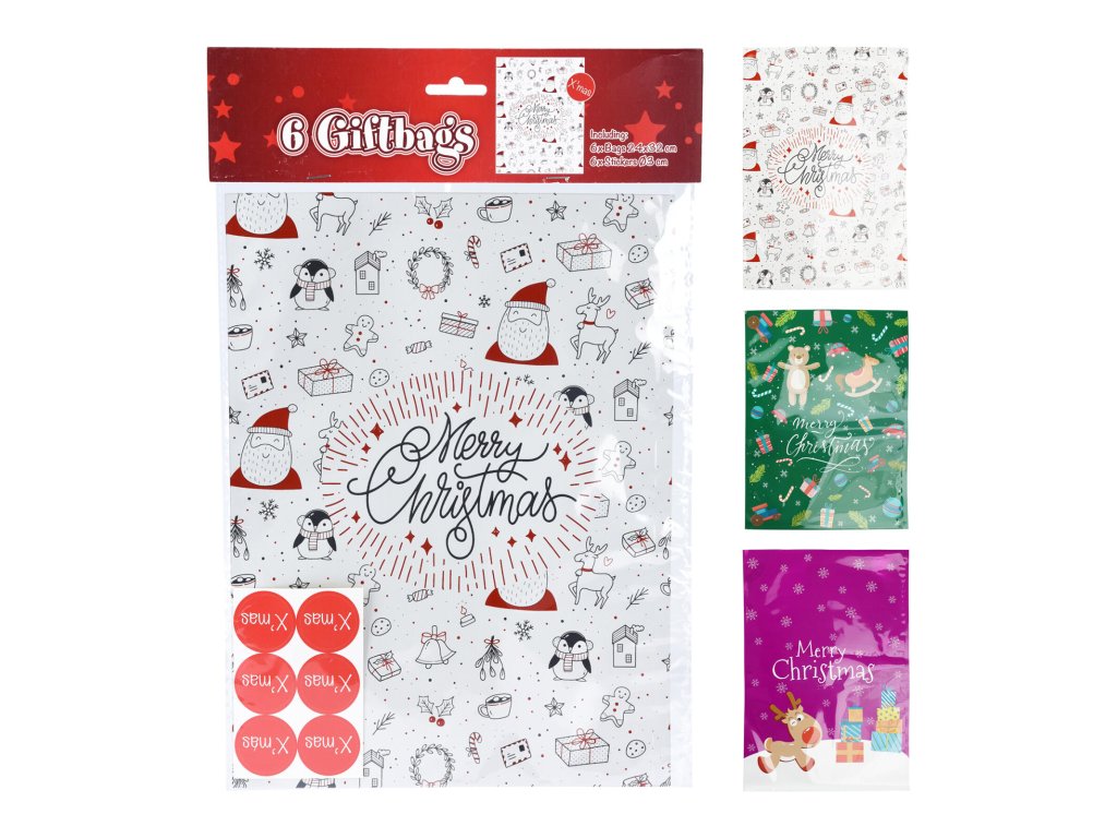 Sáček dárkový 32 x 24 cm (6 ks), samolepky pr. 3 cm (6 ks), dekor č. 1, mix barev. rozměry sáčku: 32 x 24 cm rozměry samolepky: průměr 3 cm balení: 6 + 6 ks materiál: polypropylen Praktické celofánové sáčky se samolepkami, vánoční design.Obrázky jsou pouze ilustrativní.