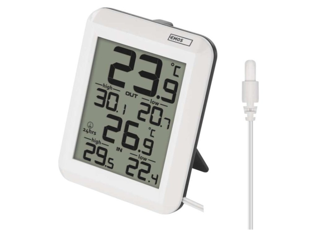 12/24 formát času: ne|barevný displej (black mask) podsvícený: ne|budík: ne|časová pásma: ne|datum: ne|dosah ve volném prostoru: ne|drátová sonda k čidlu: 0,9 m|funkce stopky: ne|hodiny: ne|kalendář: ne|LED podsvícení displeje: ne|magnet na připevnění: ne|min. a max. teplota: ano|možné další čidlo: ne|možnost nastavení jednotky teploty: °C/°F|možnost pověšení na zeď: ano|napájení čidla: ne|napájení stanice: 2× 1,5 V AAA (nejsou součástí balení)|odpočet času max. od: ne|opakované buzení: ne|paměť poslední hodnoty: ne|přenosová frekvence: ne|prodejní obal: 1 ks, krabička|provedení teploměru: drátový|rozměr čidla: ne|rozměr hlavní jednotky: 19 × 58 × 75 mm|síťový adaptér: ne|teplotní index: ne|teplotní výstraha: ne|trend teploty: ne|trend tlaku: ne|trvalé podsvícení: ne|velikost displeje: 41 × 52 mm|venkovní teplota: -40 °C až +60 °C, rozlišení 0,1 °C|venkovní vlhkost: ne|vnitřní teplota: 0 °C až +60 °C, rozlišení 0,1 °C|vnitřní vlhkost: neObrázky jsou pouze ilustrativní.