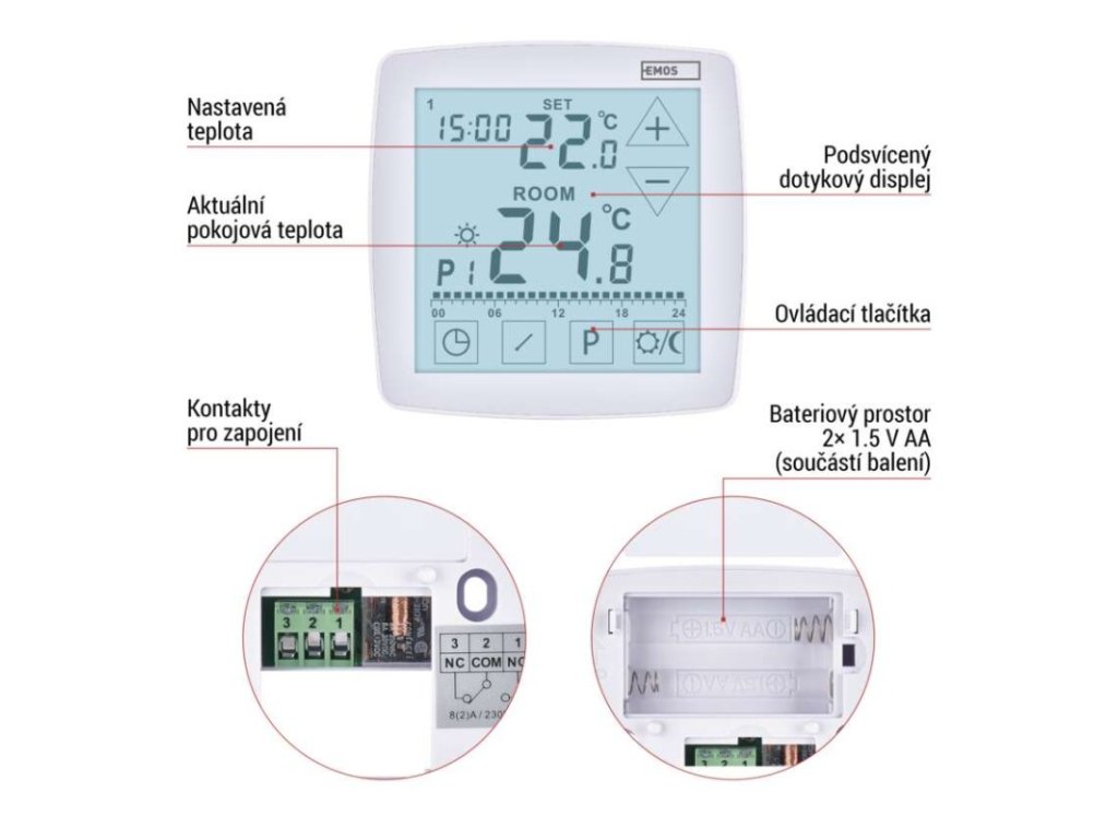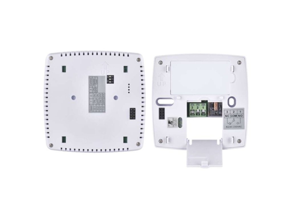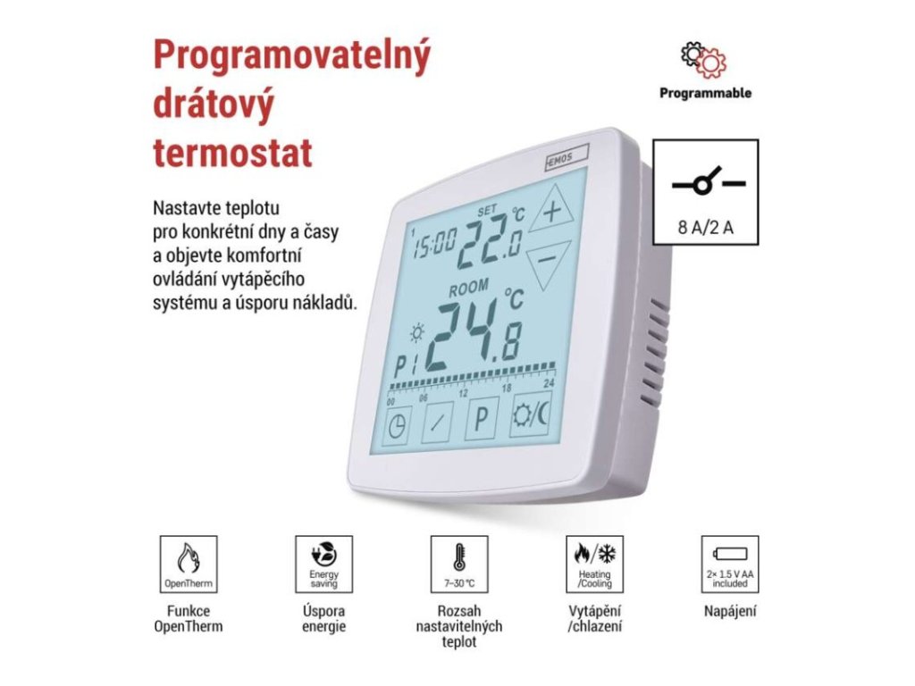 barva: bílá|délka kapilárového čidla: –|dosah ve volném prostoru: –|druh regulace: vytápěcí a chladící systém|funkce ON/OFF: ano|funkce prázdniny: ano|funkce Set-back: ne|jazyky aplikace: –|kalibrace teploty: ano|kompatibilita: –|měření teploty: 0 °C až 40 °C, rozlišení 0,1 °C|možnost propojení s dalšími detektory: ne|napájení: 2× 1,5 V AA (součástí dodávky)|napájení brány: –|napájení přijímače: –|napájení vysílače: –|nastavení teploty: 7 °C až 30 °C, po 0,2 °C|nastavitelný rozptyl teploty: 0,1 °C, 0,2 °C, 0,5 °C, 1,0 °C|notifikace do mobilní aplikace: ne|ochrana proti zamrznutí: ano|ovládání hlasovými asistenty: ne|počet programů: 6 + 3 uživatelsky nastavitelné|podlahové čidlo: –|podporované OS: –|podsvícený displej: ano|pracovní frekvence: –|přenosová frekvence: –|prodejní obal: 1 ks, krabička|protokol: –|rozměr: –|rozměr brány: –|rozměr přijímače: –|rozměr vysílače: 98 × 31 × 98 mm|součást balení: neuvádí se|spínaná zátěž: 8 A odporově, 2 A induktivně|spínání: 230 V AC nebo beznapěťové|typ nastavení teploty: komfortní a úsporná teplota|typ ovládání: programovatelný elektronický pokojový termostat|typ termostatu: drátový s OpenTherm komunikacíObrázky jsou pouze ilustrativní.