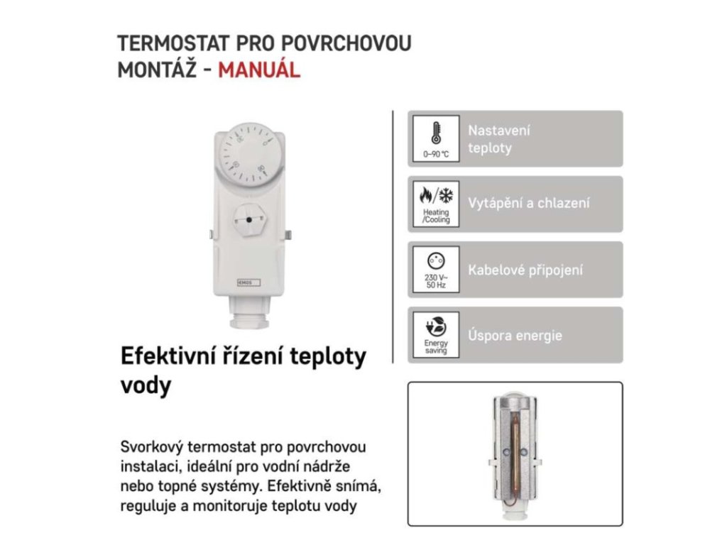 barva: bílá|délka kapilárového čidla: neuvádí se|dosah ve volném prostoru: neuvádí se|druh regulace: vytápěcí a chladící systém|funkce ON/OFF: ne|funkce prázdniny: ne|funkce Set-back: neuvádí se|kalibrace teploty: ne|měření teploty: 0 °C až 90 °C|možnost propojení s dalšími detektory: neuvádí se|napájení: 230 V, 400 V AC|napájení brány: neuvádí se|napájení přijímače: neuvádí se|napájení vysílače: neuvádí se|nastavení teploty: 0 °C až 90 °C, rozlišení 5 °C|nastavitelný rozptyl teploty: neuvádí se|ochrana proti zamrznutí: ne|počet programů: neuvádí se|podsvícený displej: neuvádí se|pracovní frekvence: neuvádí se|prodejní obal: 1 ks, krabička|protokol: –|rozměr: 38 × 54 × 105 mm|rozměr brány: neuvádí se|rozměr přijímače: neuvádí se|rozměr vysílače: neuvádí se|součást balení: neuvádí se|spínaná zátěž: 16 A odporově, 4 A induktivně|spínání: napěťové 230 V AC, 50 Hz|typ nastavení teploty: neuvádí se|typ ovládání: manuální termostat|typ termostatu: drátový příložnýObrázky jsou pouze ilustrativní.