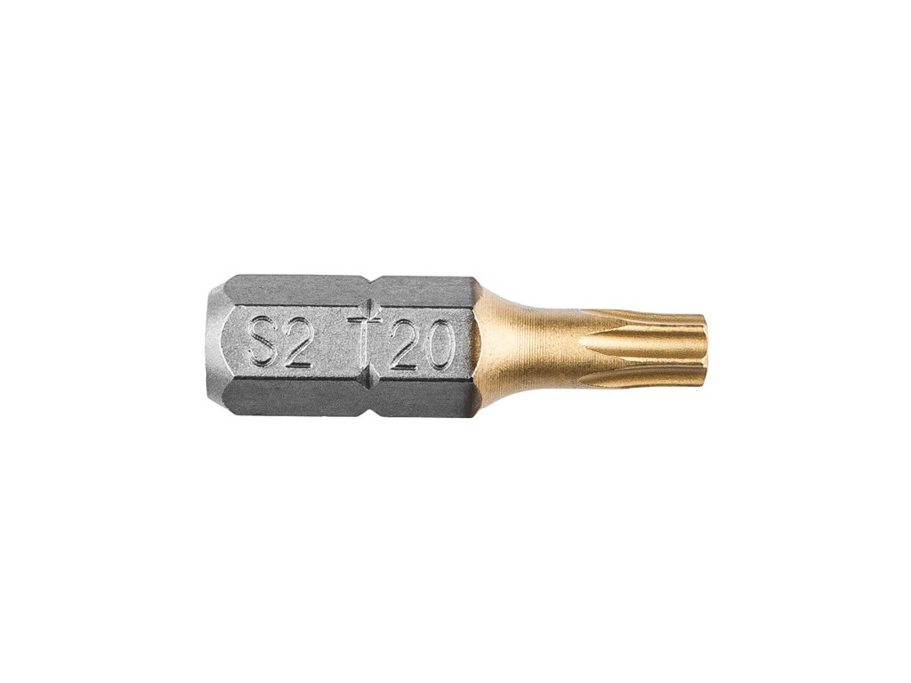 Šroubovací bity TX20 x 25 mm, 1/4", s povlakem nitridu titanu, ocel S2, sada 2 ks Šroubovací bity GRAPHITE se stopkou 1/4" pro utahování/uvolňování šroubů. Povrchová vrstva nitridu titanu (zlatá barva) výrazně prodlužuje životnost nářadí, zejména díky utvrzení místa kontaktu s hlavou šroubu.Obrázky jsou pouze ilustrativní.
