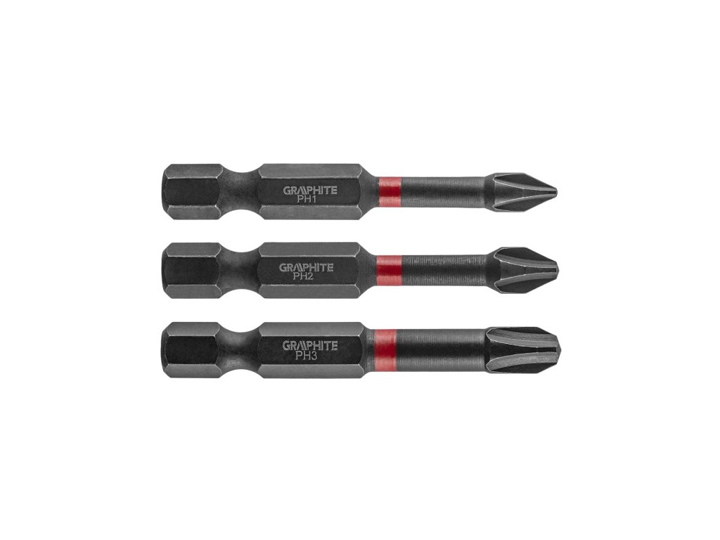 Rázové bity, typ PH1/2/3, celková délka 50 mm, ocel S2, pohon 1/4", 3 ks. Rázové bity GRAPHITE (č. 56H543) typ PH1/2/3, celková délka 50 mm, jsou robustní bity určené pro použití s větším krouticím momentem pomocí šroubováků nebo rázových utahováků. Vyrobeno z vysoce kvalitní oceli S2, která má zvýšenou pružnost a odolnost proti mechanickému poškození. Torzní zóna, která se otáčí při vysokém točivém momentu, snižuje přenos síly, čímž se zvyšuje odolnost bitu proti zlomení a několikanásobně se prodlužuje jeho životnost. Pracovní konec bitu zaručuje dokonalé uchycení. Značka GRAPHITE nabízí širokou škálu elektrického nářadí, které splňuje potřeby profesionálů.Obrázky jsou pouze ilustrativní.