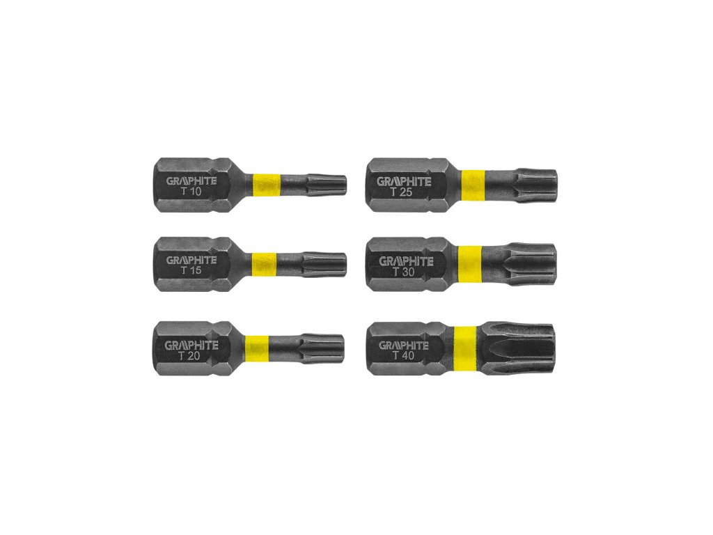 Rázové bity, typ TX10/15/20/25/30/40, celková délka 25 mm, ocel S2, pohon 1/4", 6 ks. Rázové bity GRAPHITE (ref. 56H541) typ TX10/15/20/25/30/40, celková délka 25 mm, jsou robustní bity určené pro použití s větším krouticím momentem pomocí šroubováků nebo rázových utahováků. Vyrobeno z vysoce kvalitní oceli S2, která má zvýšenou pružnost a mechanickou pevnost. Torzní zóna, která se otáčí při vysokém točivém momentu, snižuje přenos síly, čímž se zvyšuje odolnost bitu proti zlomení a několikanásobně se prodlužuje jeho životnost. Pracovní konec bitu zaručuje dokonalé uchycení. Značka GRAPHITE nabízí široký sortiment elektrického nářadí, které vyhovuje potřebám profesionálů.Obrázky jsou pouze ilustrativní.