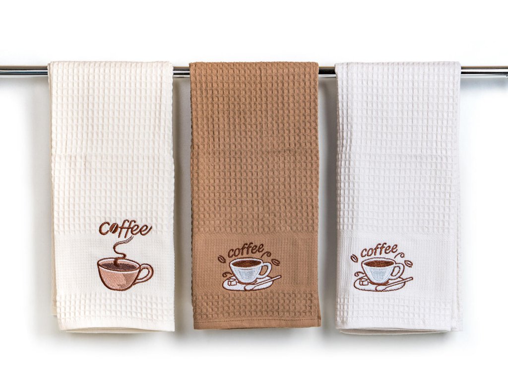 Utěrka kuchyňská COFFEE, 45 x 70 cm, BA, mix barev (3 ks). rozměry: 45 x 70 cm materiál: 100 % bavlna mix barev: bílá, krémová, béžová balení: 3 ks Vaflové utěrky s výšívkou COFFEE jsou nepostradatelnými pomocníky ve vaší kuchyni.Obrázky jsou pouze ilustrativní.