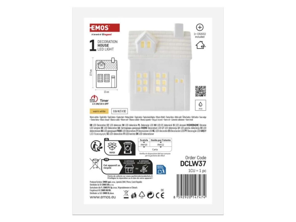 barva drátu: –|barva světla: teplá bílá|časovač: ano|dálkový ovladač: ne|délka přívodu: –|krytí: IP20|materiál: keramika|počet LED: 1|použití: vnitřní|příkon: 0,06 W|prodejní obal: 1 ks, krabice|produkt: domeček|rozměr: 130 × 65 ×179 mm|typ napájení: baterie 1× CR2032 (součástí balení)|vstupní napětí: –|výstupní napětí: 3 V DC|záruční doba: 2 roky|zdroj svícení: LED|životnost: 10 000 hodinObrázky jsou pouze ilustrativní.