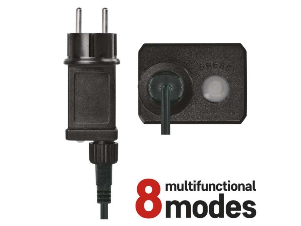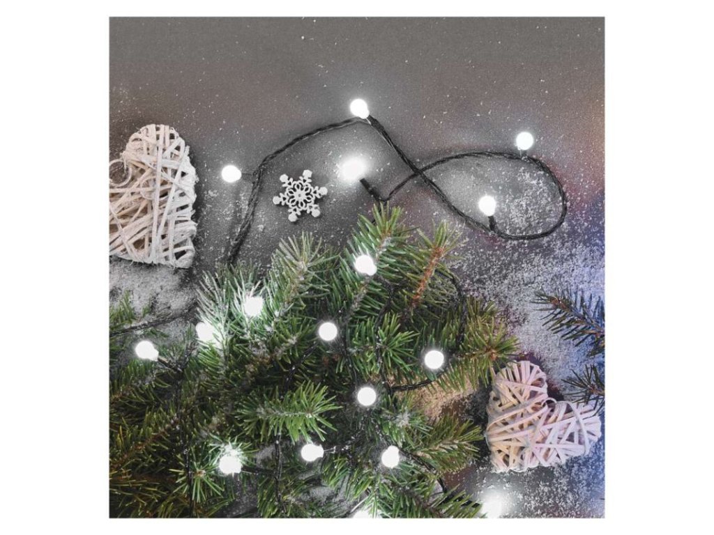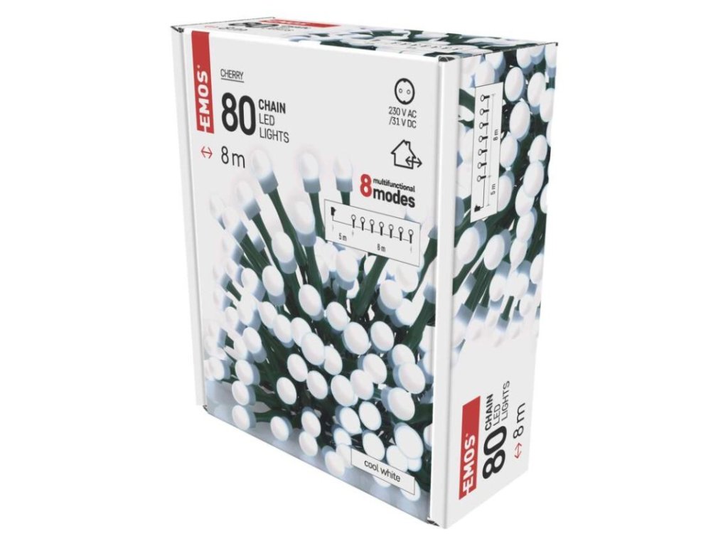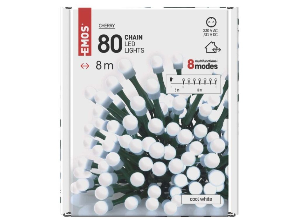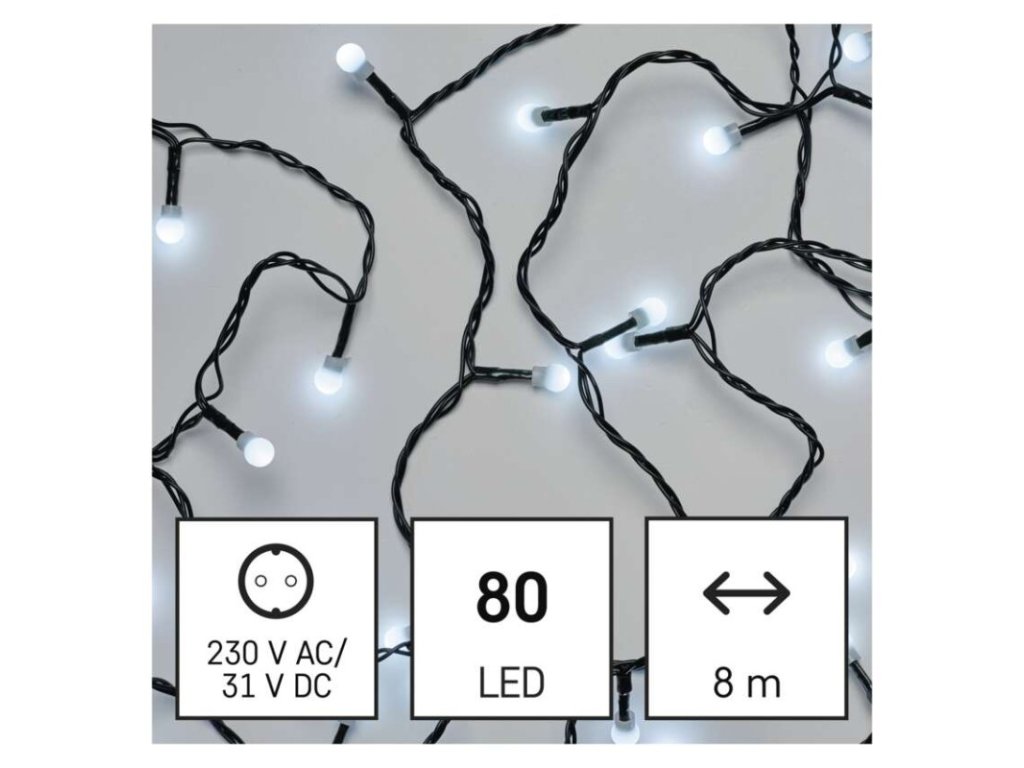 barva drátu: zelená|barva světla: studená bílá|časovač: ne|dálkový ovladač: ne|délka přívodu: 5 m|funkce: 8 módů (multifunkce)|krytí: IP44|LED mezera: 10 cm|materiál: PVC|možnost propojení: ne|počet LED: 80|použití: venkovní i vnitřní|příkon: 3,6 W|prodejní obal: 1 ks, krabice|produkt: řetěz|pro výšku stromu: 140 cm|rozměr: 8 m|tvar: kulička|typ napájení: síťový adaptér|velikost LED: 10 mm|vstupní napětí: 230 V AC|výstupní napětí: 31 V DC|záruční doba: 2 roky|životnost: 10 000 hodinObrázky jsou pouze ilustrativní.