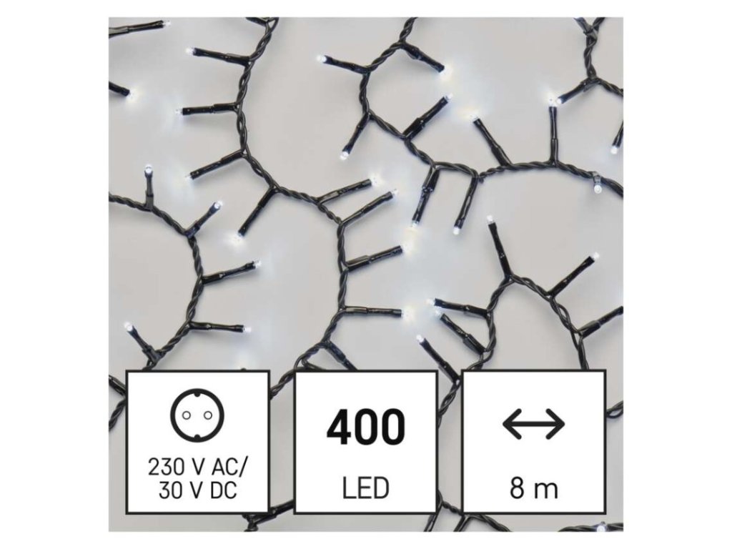 barva drátu: černá|barva světla: studená bílá|časovač: ano|dálkový ovladač: ne|délka přívodu: 5 m|funkce: svítí|krytí: IP44|LED mezera: 2 cm|materiál: PVC|možnost propojení: ne|počet LED: 400|použití: venkovní i vnitřní|příkon: 3,6 W|prodejní obal: 1 ks, krabice|produkt: ježek|pro výšku stromu: neuvádí se|rozměr: 8 m|tvar: klasický|typ napájení: síťový adaptér|velikost LED: 3 mm|vstupní napětí: 230 V AC|výstupní napětí: 30 V DC|záruční doba: 2 roky|životnost: 10 000 hodinObrázky jsou pouze ilustrativní.