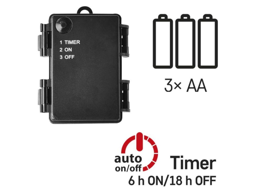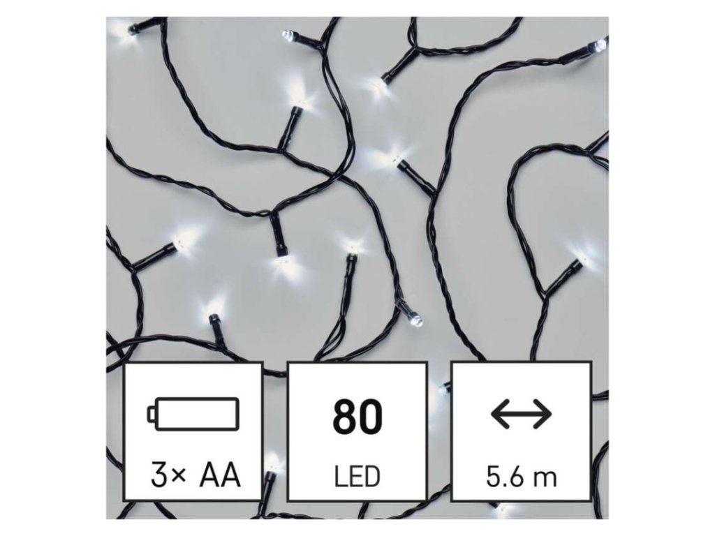 barva drátu: černá|barva světla: studená bílá|časovač: ano|dálkový ovladač: ne|délka přívodu: 0,5 m|funkce: svítí|krytí: IP44|LED mezera: neuvádí se|materiál: PVC|možnost propojení: ne|počet LED: 80|použití: venkovní i vnitřní|příkon: 0,9 W|prodejní obal: 1 ks, krabice|produkt: řetěz|pro výšku stromu: neuvádí se|rozměr: 5,6 m|tvar: neuvádí se|typ napájení: baterie 3× AA (není součástí balení)|velikost LED: neuvádí se|vstupní napětí: neuvádí se|výstupní napětí: 4,5 V DC|záruční doba: 2 roky|životnost: 10 000 hodinObrázky jsou pouze ilustrativní.
