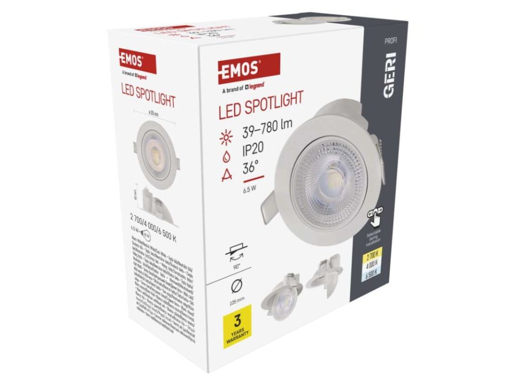 barva světla: teplá/neutrální/studená bílá|barva těla: bílá|dálkový ovladač: ne|další funkce: –|do chodby a na schodiště: ano|do dílny a garáže: ne|do kanceláře: ano|do koupelny: ne|do kuchyně: ano|do obýváku, ložnice a dětského pokoje: ano|dosah senzoru: neuvádí se|flicker-free: ano|frekvence: 50/60 Hz|index podání barev (CRI): Ra > 80|jazyky aplikace: –|kategorie: PROFI|kompatibilita: –|krytí: IP20|materiál difuzoru: plast (PC)|materiál LGP: neuvádí se|materiál těla: hliník|montážní otvor: 87 mm|možnost stmívání: ano – Triac|náhrada za žárovku: 60 W|napětí: 220–240 V~|na zahradu a balkon: ne|notifikace do mobilní aplikace: ne|obsah balení: –|ovládání hlasovými asistenty: ne|podporované OS: –|pohybový senzor: ne|přenosová frekvence: –|příkon: 6,5 W|prodejní obal: 1 ks, krabice|protokol: –|proud: 150 mA|řada: GERI|rozměr: průměr 105 × 40 mm|světelná účinnost: 120 lm/W|světelný tok: 780 lm|teplota chromatičnosti: 2 700/4 000/6 500 K|tvar: kruh|typ difuzoru: mikroprizmatický|typ svítidla: klasické svítidlo|účiník: > 0,7|UGR<: neuvádí se|úhel vyzařování: 36°|umístění: stropní|výstupní proud ze zdroje: neuvádí se|záruční doba: 3 roky|zdroj světla: LED|životnost: 30 000 hodin|způsob montáže: vestavnéObrázky jsou pouze ilustrativní.