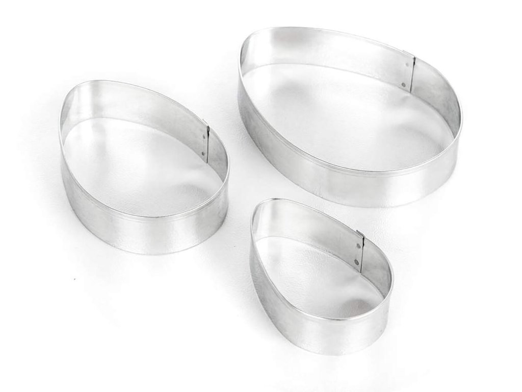 Vykrajovačka cukroví VEJCE sada 3díl. sada obsahuje 3 vejce: - malé vajíčko 5,5 x 3,5 cm - střední vajíčko 7 x 5 cm - velké vajíčko 8,4 x 6,5 cm materiál: pocínovaný plech Vykrajovátka CULINARIA vajíčka jsou skvělým pomocníkem při pečení.Obrázky jsou pouze ilustrativní.