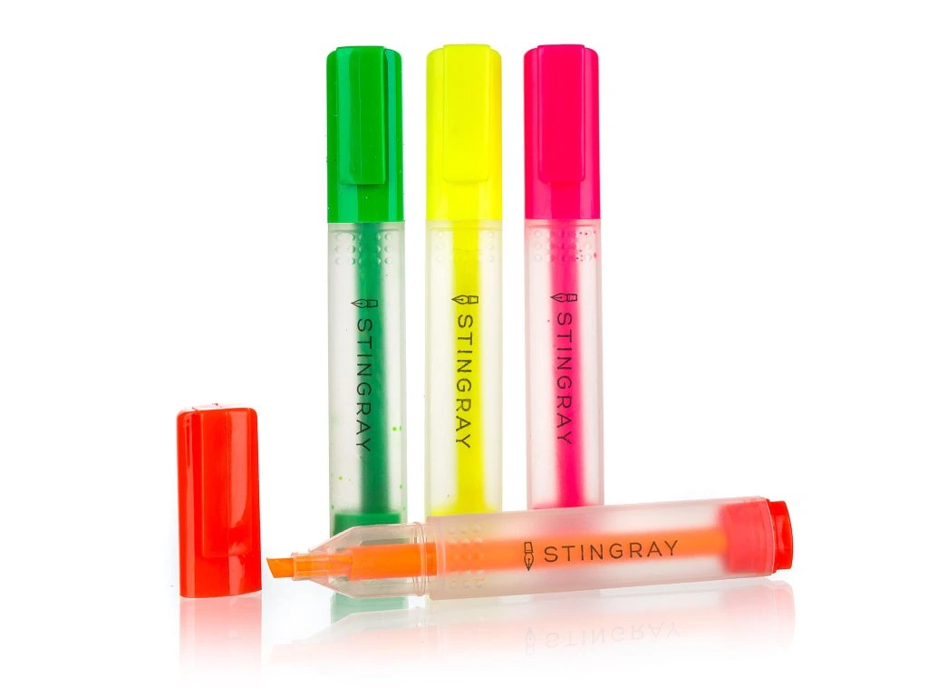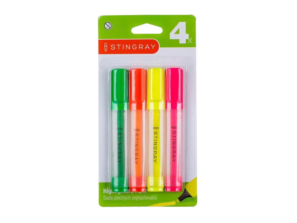 Zvýrazňovač plochý, mix barev (4 ks). šířka linky: 0,5 cm mix barev: žlutá, zelená, růžová, oranžová Sada zvýrazňovačů se zkoseným hrotem. Jsou určeny pro zvýraznění textu na dokumentech. Zvýrazňovače jsou vhodné k použití ve škole i v kanceláři.Obrázky jsou pouze ilustrativní.