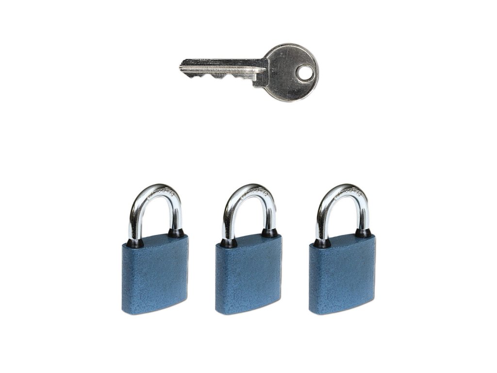 Zámek visací OVAL.38 SET 3 zámků na SU 6 kl. Set 3 ks visacích zámků na společný uzávěr – „SU“. Náhodný kód klíče. Klasický litinový zámek. Třmen HARDENED, jištěný ve dvou bodech. Gumové kroužky chránící litinové těleso proti průniku vody. Zamykání bez klíče - zatlačením třmenu. Vložka zámku s 5 odpruženými stavítky. povrchová úprava: modrý komaxit hmotnost netto: 0,38 kg / set Balení vč. 6 ks klíčů.Obrázky jsou pouze ilustrativní.