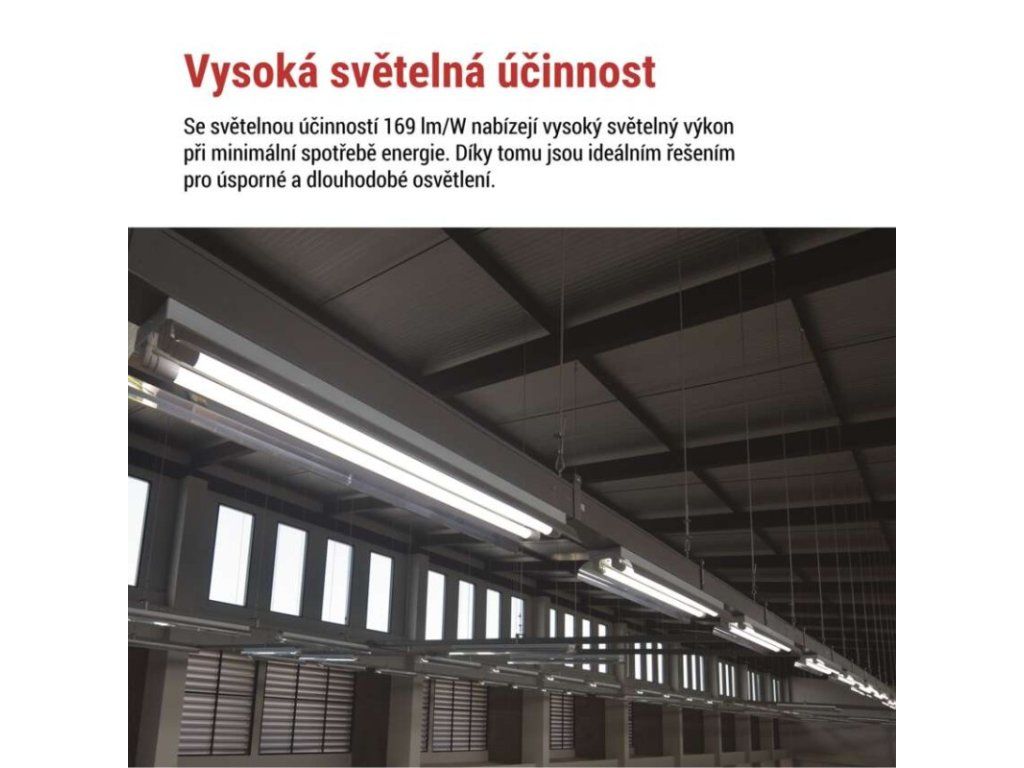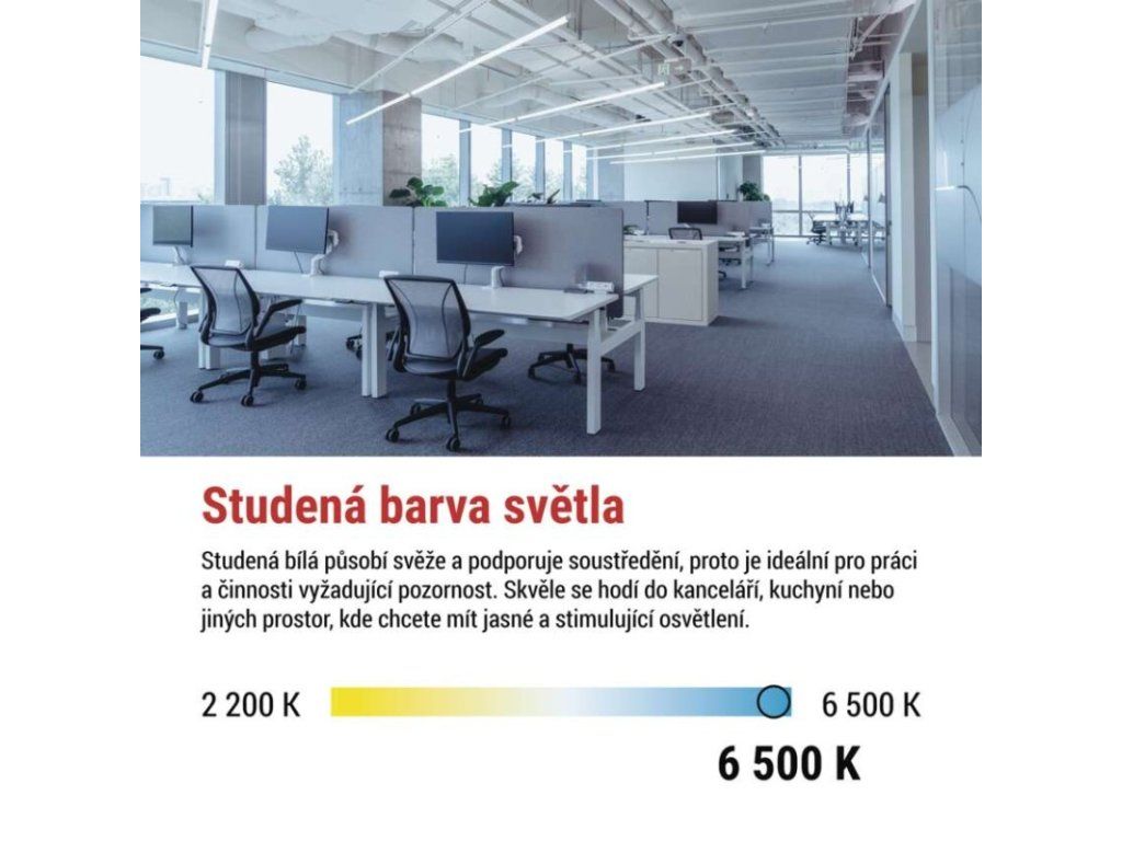 barva světla: studená bílá|energetická třída: C|index podání barev (CRI): 80|kompatibilita: –|náhrada za žárovku: –|napětí: 230 V~/50 Hz|notifikace do mobilní aplikace: –|ovládání hlasovými asistenty: –|patice (uchycení žárovky): G13|počet čipů: –|počet spínacích cyklů: 200 000|podporované OS: –|přenosová frekvence: –|příkon: 6,5 W|prodejní obal: 10 ks, krabička|protokol: –|řada: PROFI PLUS|rozměr: 603 × 27 × 27 mm|stmívatelná: ne|světelná účinnost: 169 lm/W|světelný tok: 1 100 lm|technologie: LED|teplota chromatičnosti: 6 500 K|tvar: T8|typ čipů: SMD|účiník: 0,90|úhel vyzařování: 250°|záruční doba: 5 let|životnost: 50 000 hodinObrázky jsou pouze ilustrativní.