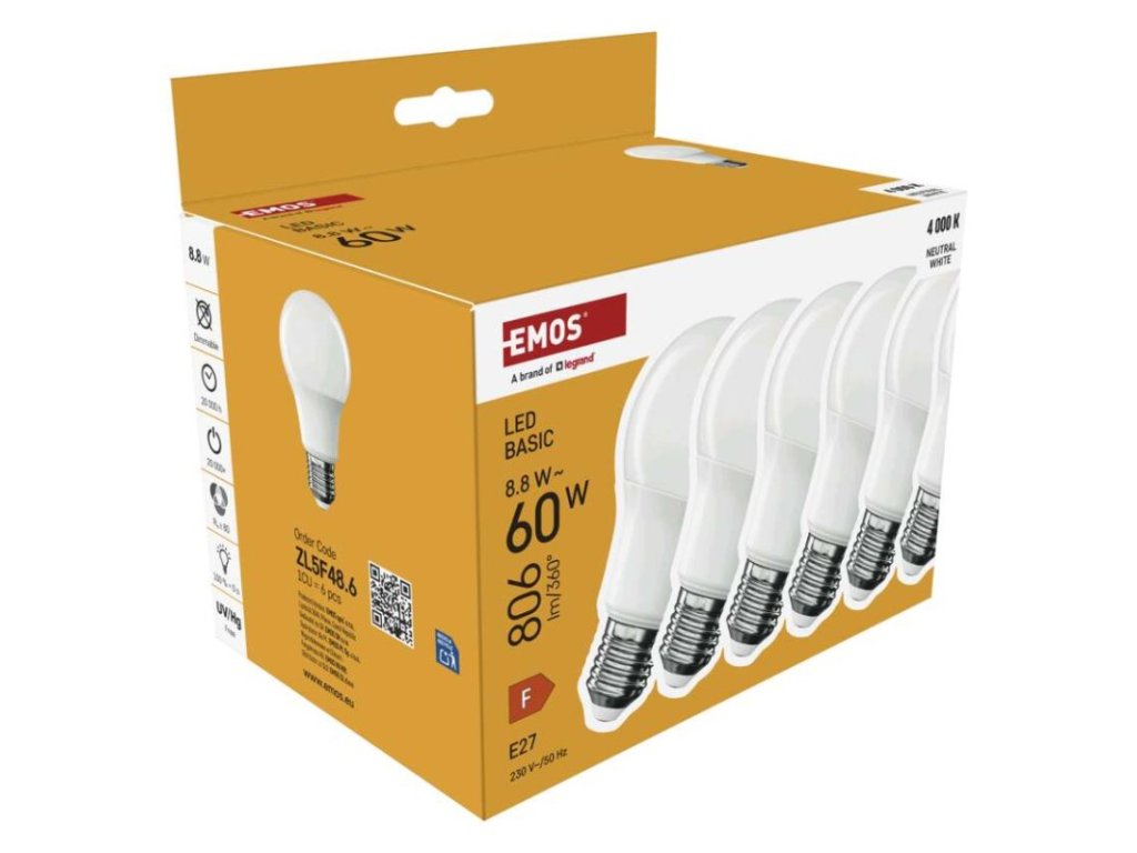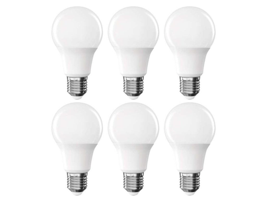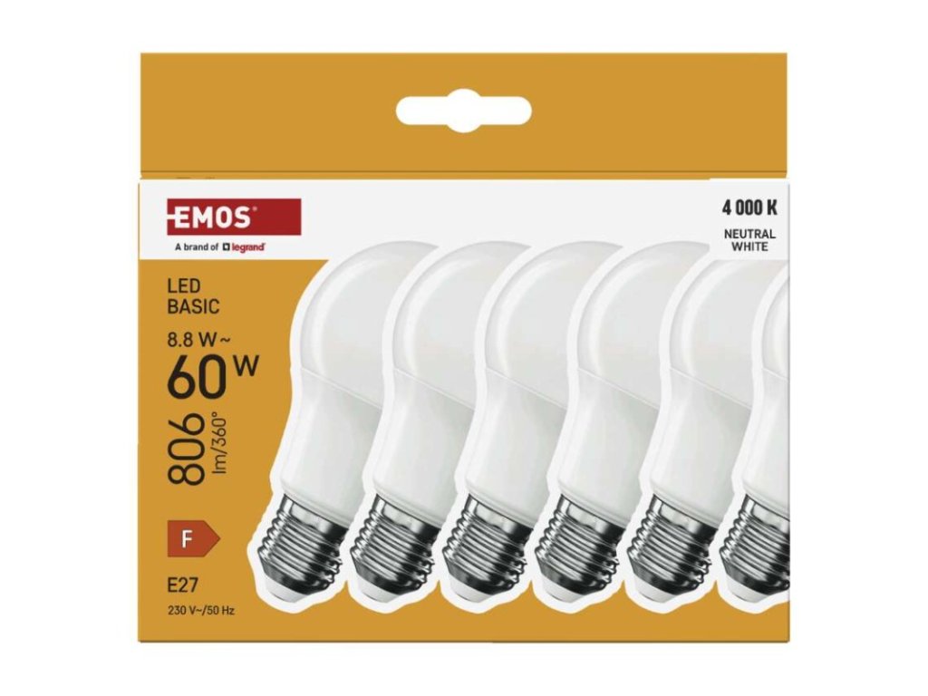 barva světla: neutrální bílá|energetická třída: F|index podání barev (CRI): 80|kompatibilita: –|náhrada za žárovku: 60 W|napětí: 230 V~/50 Hz|notifikace do mobilní aplikace: ne|ovládání hlasovými asistenty: ne|patice (uchycení žárovky): E27|počet čipů: neuvádí se|počet spínacích cyklů: 20 000|podporované OS: –|přenosová frekvence: –|příkon: 8,8 W|prodejní obal: 6 ks, krabička|protokol: –|řada: BASIC|rozměr: 60 × 60 × 110 (max.) mm|stmívatelná: ne|světelná účinnost: 92 lm/W|světelný tok: 806 lm|technologie: LED|teplota chromatičnosti: 4 000 K|tvar: A60|typ čipů: SMD|účiník: 0,50|úhel vyzařování: 200°|záruční doba: 2 roky|životnost: 20 000 hodinObrázky jsou pouze ilustrativní.