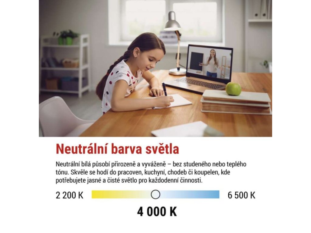 barva světla: neutrální bílá|energetická třída: D|frekvence: 50/60 Hz|index podání barev (CRI): 80|kompatibilita: –|náhrada za žárovku: 120 W|napětí: 220-240 V~|notifikace do mobilní aplikace: –|ovládání hlasovými asistenty: –|patice (uchycení žárovky): E27|počet čipů: –|počet spínacích cyklů: 30 000|podporované OS: –|přenosová frekvence: –|příkon: 14 W|prodejní obal: 1 ks, krabička|protokol: –|řada: CLASSIC|rozměr: 60 × 60 × 120 mm|stmívatelná: ne|světelná účinnost: 136 lm/W|světelný tok: 1 901 lm|technologie: LED|teplota chromatičnosti: 4 000 K|tvar: Classic A60|typ čipů: SMD|účiník: 0,59|úhel vyzařování: 180°|záruční doba: 3 roky|životnost: 30 000 hodinObrázky jsou pouze ilustrativní.