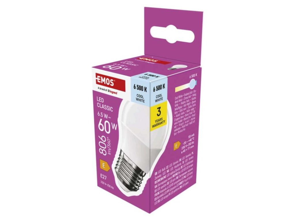 barva světla: studená bílá|energetická třída: E|index podání barev (CRI): 80|kompatibilita: –|náhrada za žárovku: 60 W|napětí: 230 V~/50 Hz|notifikace do mobilní aplikace: ne|ovládání hlasovými asistenty: ne|patice (uchycení žárovky): E27|počet čipů: neuvádí se|počet spínacích cyklů: 30 000|podporované OS: –|přenosová frekvence: –|příkon: 6,5 W|prodejní obal: 1 ks, krabička|protokol: –|řada: CLASSIC|rozměr: 45 × 45 × 77 mm|stmívatelná: ne|světelná účinnost: 124 lm/W|světelný tok: 806 lm|technologie: LED|teplota chromatičnosti: 6 500 K|tvar: Mini Globe|typ čipů: SMD|účiník: 0,50|úhel vyzařování: 150°|záruční doba: 3 roky|životnost: 30 000 hodinObrázky jsou pouze ilustrativní.