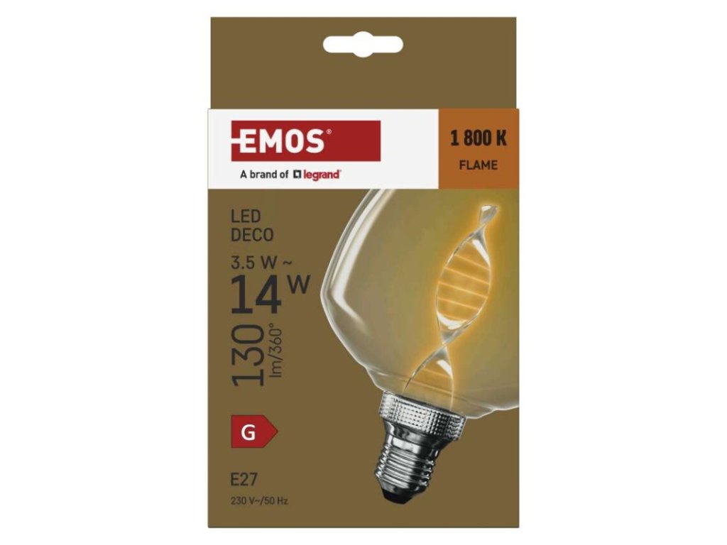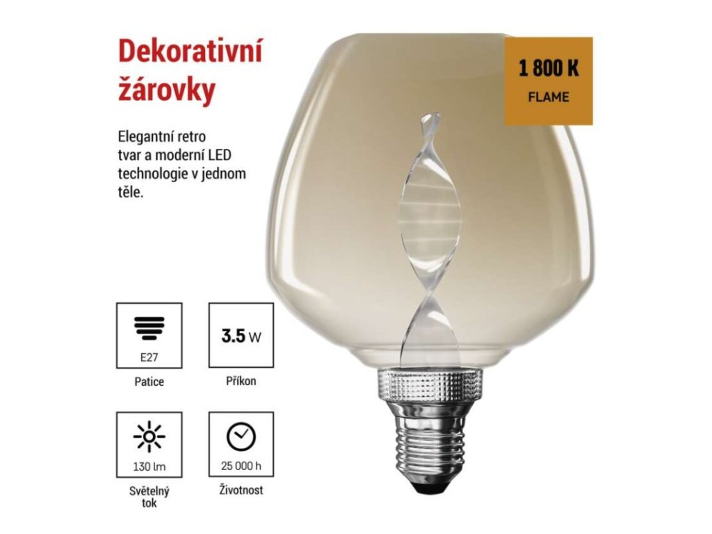 barva světla: Flame|energetická třída: G|frekvence: 50/60 Hz|index podání barev (CRI): 80|kompatibilita: –|náhrada za žárovku: 14 W|napětí: 220-240 V~|notifikace do mobilní aplikace: –|ovládání hlasovými asistenty: –|patice (uchycení žárovky): E27|počet čipů: –|počet spínacích cyklů: 25 000|podporované OS: –|přenosová frekvence: –|příkon: 3,5 W|prodejní obal: 1 ks, krabička|protokol: –|řada: DECO|rozměr: 123 × 123 × 163 mm|stmívatelná: ne|světelná účinnost: 37 lm/W|světelný tok: 130 lm|technologie: LED|teplota chromatičnosti: 1 800 K|tvar: S123|typ čipů: COB|účiník: 0,40|úhel vyzařování: 330°|záruční doba: 2 roky|životnost: 25 000 hodinObrázky jsou pouze ilustrativní.