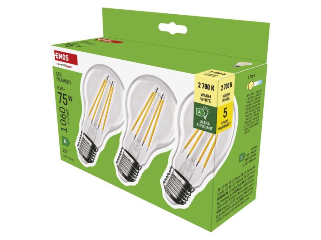barva světla: teplá bílá|energetická třída: A|index podání barev (CRI): 80|kompatibilita: –|náhrada za žárovku: 75 W|napětí: 230 V~/50 Hz|notifikace do mobilní aplikace: –|ovládání hlasovými asistenty: –|patice (uchycení žárovky): E27|počet čipů: 4|počet spínacích cyklů: 30 000|podporované OS: –|přenosová frekvence: –|příkon: 5 W|prodejní obal: 3 ks, krabička|protokol: –|řada: FILAMENT|rozměr: 60 × 60 × 108 mm|stmívatelná: ne|světelná účinnost: 212 lm/W|světelný tok: 1 060 lm|technologie: LED|teplota chromatičnosti: 2 700 K|tvar: A60|typ čipů: COB|účiník: 0,5|úhel vyzařování: 360°|záruční doba: 5 let|životnost: 50 000 hodinObrázky jsou pouze ilustrativní.