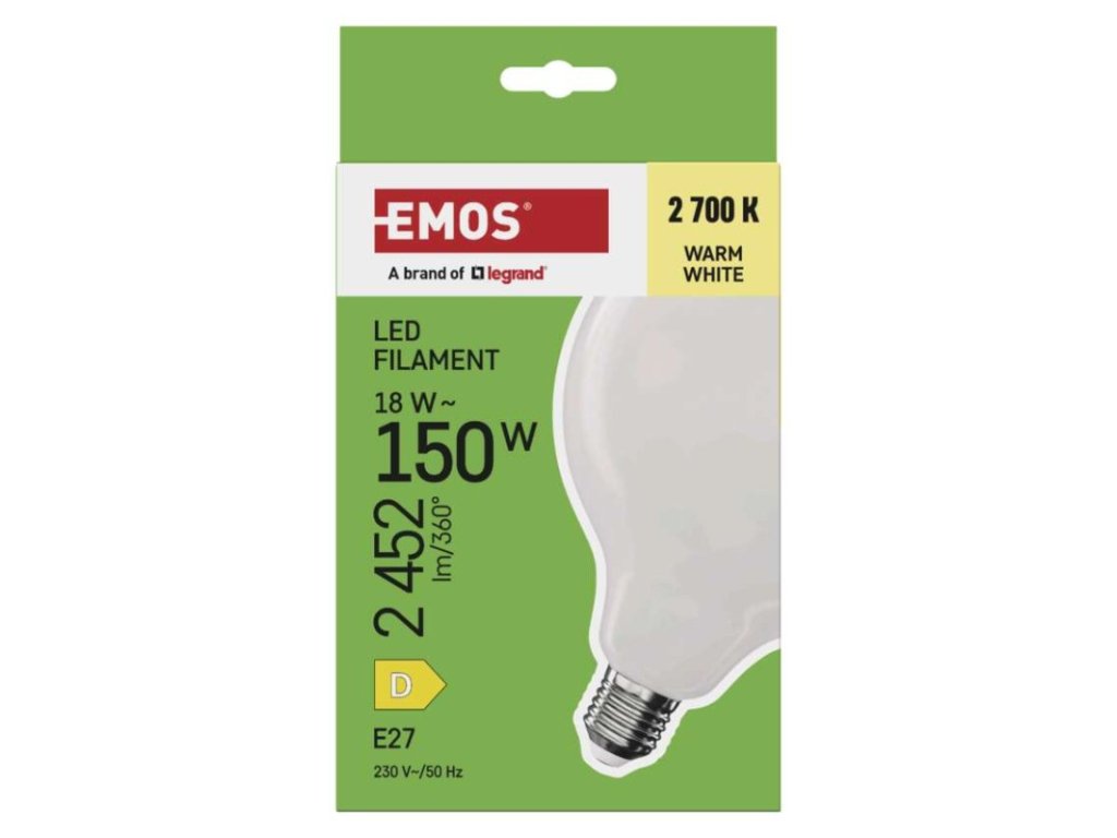 barva světla: teplá bílá|energetická třída: D|index podání barev (CRI): 80|kompatibilita: –|náhrada za žárovku: 150 W|napětí: 230 V~/50 Hz|notifikace do mobilní aplikace: ne|ovládání hlasovými asistenty: ne|patice (uchycení žárovky): E27|počet čipů: 8|počet spínacích cyklů: 25 000|podporované OS: –|přenosová frekvence: –|příkon: 18 W|prodejní obal: 1 ks, krabička|protokol: –|řada: FILAMENT|rozměr: 125 × 125 × 178 mm|stmívatelná: ne|světelná účinnost: 136 lm/W|světelný tok: 2 452 lm|technologie: LED|teplota chromatičnosti: 2 700 K|tvar: G125|typ čipů: COB|účiník: 0,50|úhel vyzařování: 360°|záruční doba: 3 roky|životnost: 25 000 hodinObrázky jsou pouze ilustrativní.