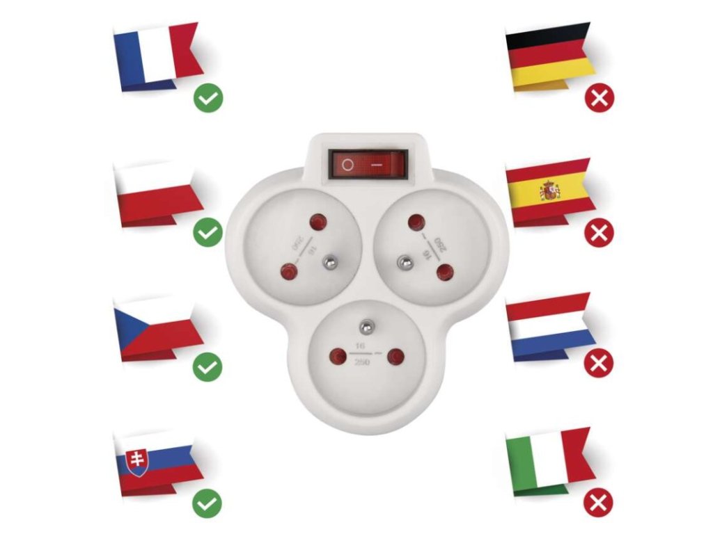 barva: bílá|dálkový ovladač: ne|dětské clonky: ano|dosah signálu: neuvádí se|easy learning: ne|krytí: IP20|materiál: plast|max. zátěž: 2 300 W|možnost ovládání: ne|napětí/proud: 250 V~/10 A max.|počet pólů: neuvádí se|počet zásuvek: 3× 2P + PE|pozice ochranného kontaktu: neuvádí se|přenosoná frekvence: ne|prodejní obal: 1 ks, závěs|produkt: rozbočovací zásuvka 3× s vypínačem|typ: FRENCH|venkovní použití: ne|vypínač: anoObrázky jsou pouze ilustrativní.