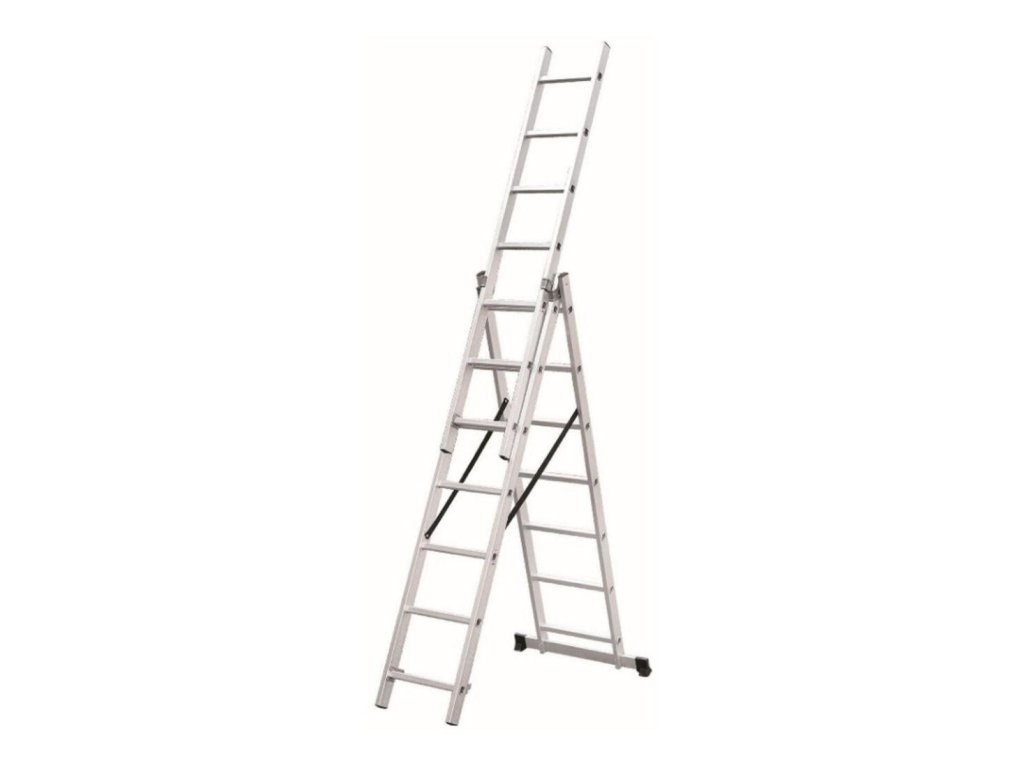 Žebřík univerzální Al, 3dílný, 9 příček, 5,93 m, nosnost 150 kg. - víceúčelový trojdílný žebřík po devíti příčkách - lze sestavit jako stojací štafle, výsuvný nebo opěrný žebřík - možnost nastavení výšky po jednotlivých příčkách - opatřen jisticími pásy - hliníkový žebřík dle normy EN 131 Kombinovatelný stojací a posuvný žebřík má různá použití. Lze jej použít jako stojací žebřík, stojací žebřík s nasazovacím dílem nebo 3dílný opěrný žebřík. materiál: hliník nosnost: 150 kg max. výsuvná délka: 5,93 m šířka: 470 mm nosnost: 150 kg počet příček: 3 x 9Obrázky jsou pouze ilustrativní.